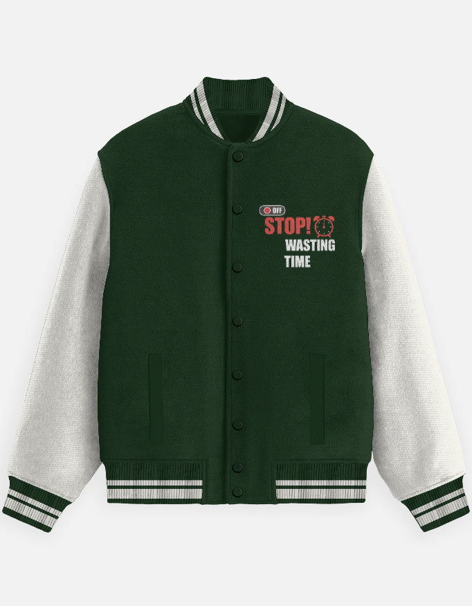 The Stop Wasting Time Graphic Unisex Varsity Jacket is a powerful wake-up call for those who understand that every moment counts. Featuring bold, no-nonsense typography that demands action, this jacket is designed for go-getters, entrepreneurs, and anyone who refuses to let precious time slip away on things that don't matter.
